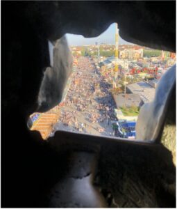 Toll ist, dass Kinder freien Eintritt haben. Innen war es ganz heiß, denn die Bronze heizt sich durch die Sonne stark auf. Vom Kopf herunter hat man einen wunderbaren Blick über das Oktoberfest. Neben der Bavaria sitzt ein großer Löwe. In der rechten Hand hält sie ein Schwert und die linke Hand hebt einen Eichenlaubkranz in die Höhe.