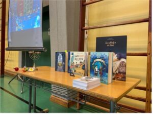 Gespannt lauschten die Kinder der 1. und 2. Klassen der Autorin, die ihr neuestes Buch „Ein Fest für alle“ vorlas. Es geht darum, dass nicht alle Weihnachten, sondern ganz unterschiedliche Feste feiern. Lustig fanden die Kinder, welche verschiedenen Feste von den Protagonisten erfunden wurden, zum Beispiel „Schneinachten“. Im Gespräch erzählten die Kinder, welche Feste sie zu Hause feiern. Maike Harel feiert mit ihrer Familie das Lichterfest Hanukkah, bei dem gleichzeitig möglichst viele Kreisel gedreht werden. Dies durften einige Kinder ausprobieren, was zu großer Begeisterung führte.