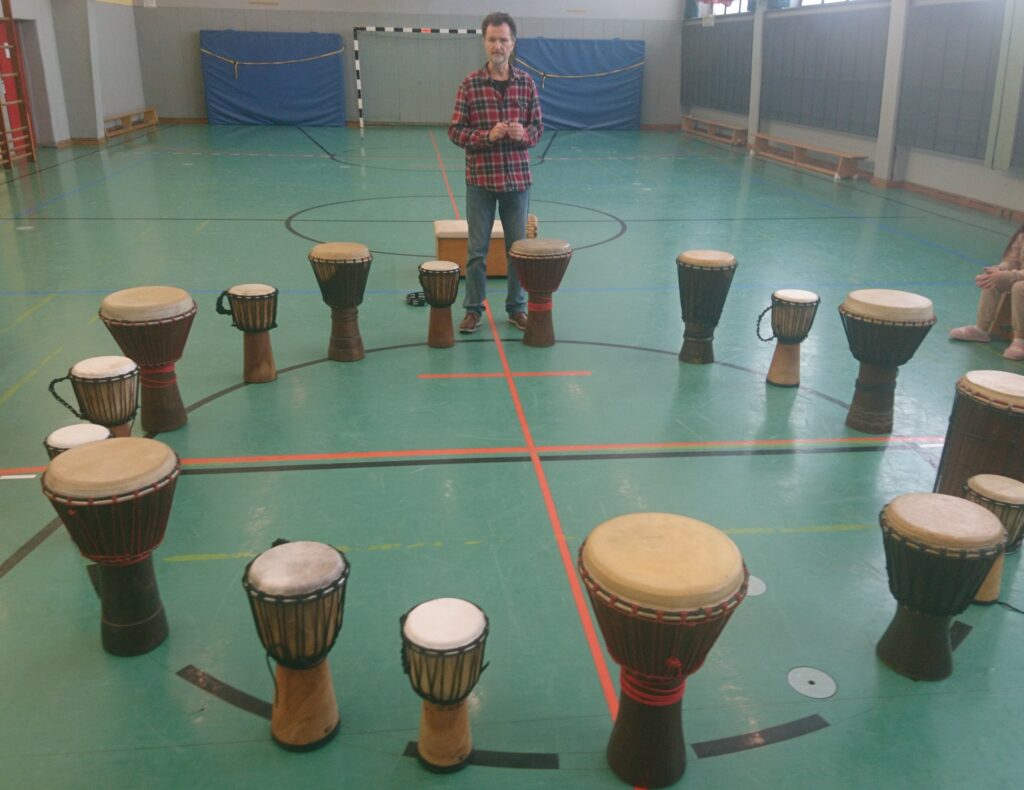 Wir starteten mit einem mehrstimmigen Trommelstück und sangen dann das Lied "Hand in Hand". Die erste Strophe hat den zwischenmenschlichen Zusammenhalt zum Thema: Aufgaben sind gemeinsam leichter zu bewältigen, solidarisches Tun macht Mut und hält die Welt zusammen. Die zweite Strophe spielt auf ein gemeinsames Miteinander trotz der Unterschiede in Alter, Geschlecht, kultureller, geographischer und religiöser Herkunft an.