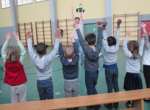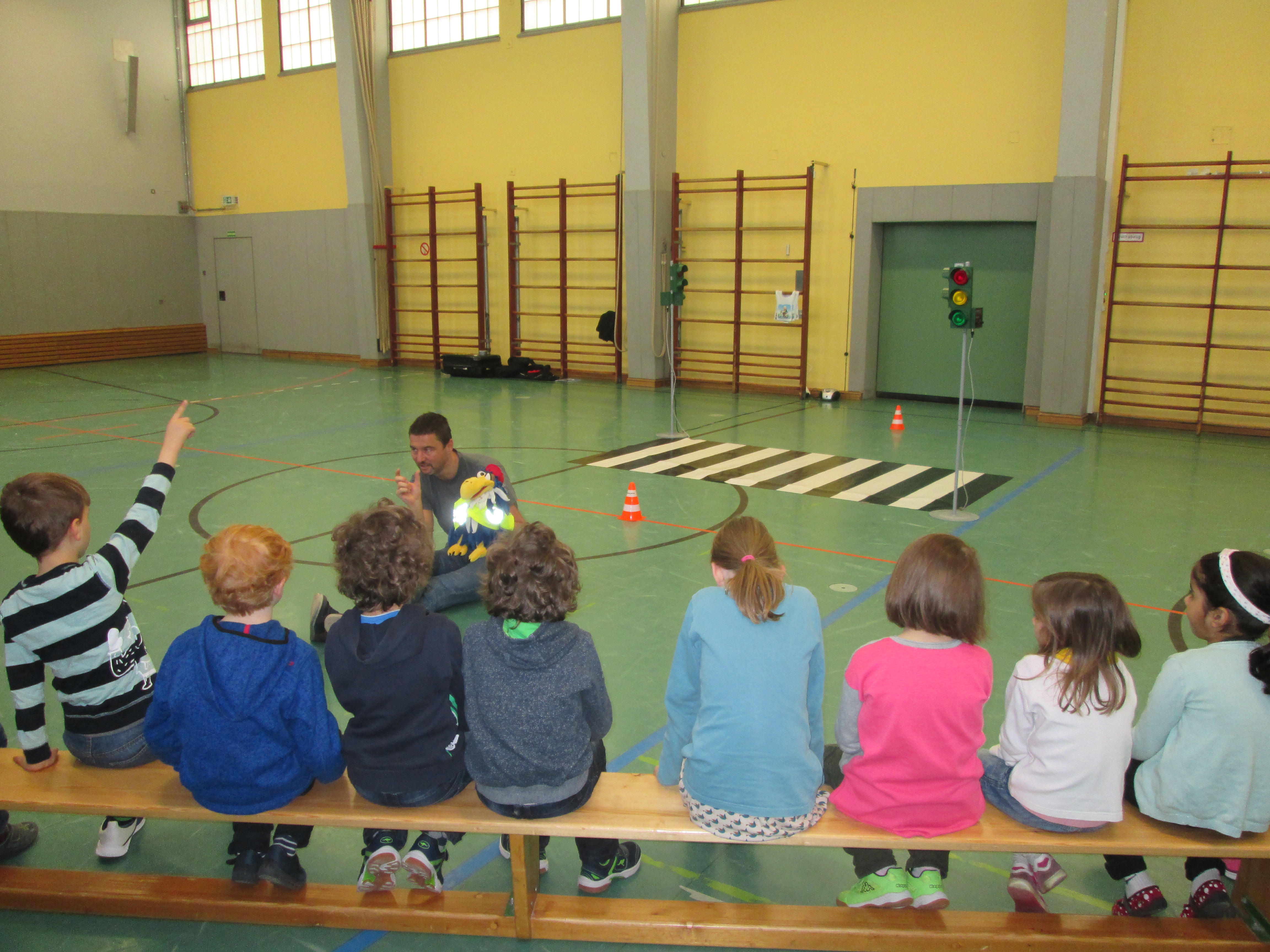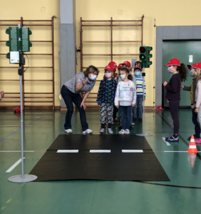 Im sicheren Raum der Turnhalle dürfen die Kinder verschiedene Rollen einnehmen, um Verkehrssituationen besser einschätzen zu können. An ein