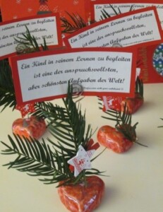 Die Adventsfeier der Klassen 3/4 am 17.12. hatte eine wichtige Ehrung als Mittelpunkt: Einige Kinder des Schülerrates bedankten sich auf liebevolle Weise bei unseren Lernhelfern, die als Ehrengäste geladen waren, mit selbst gebastelten Tonherzen und Weihnachtskarten. Mit eindrucksvollen Worten machten sie allen deutlich, wie wichtig und wertvoll deren Arbeit für die gesamte Schulfamilie ist.