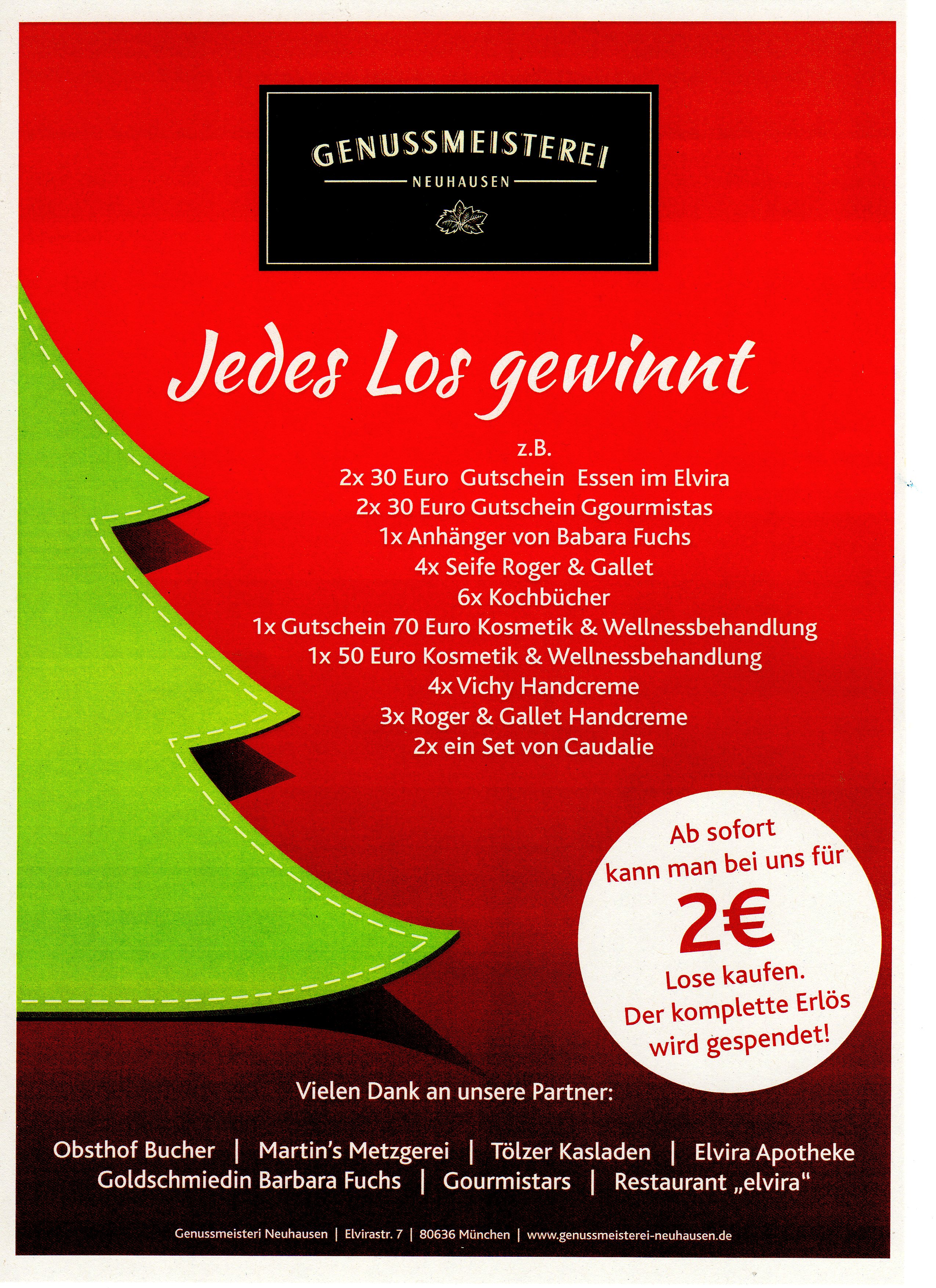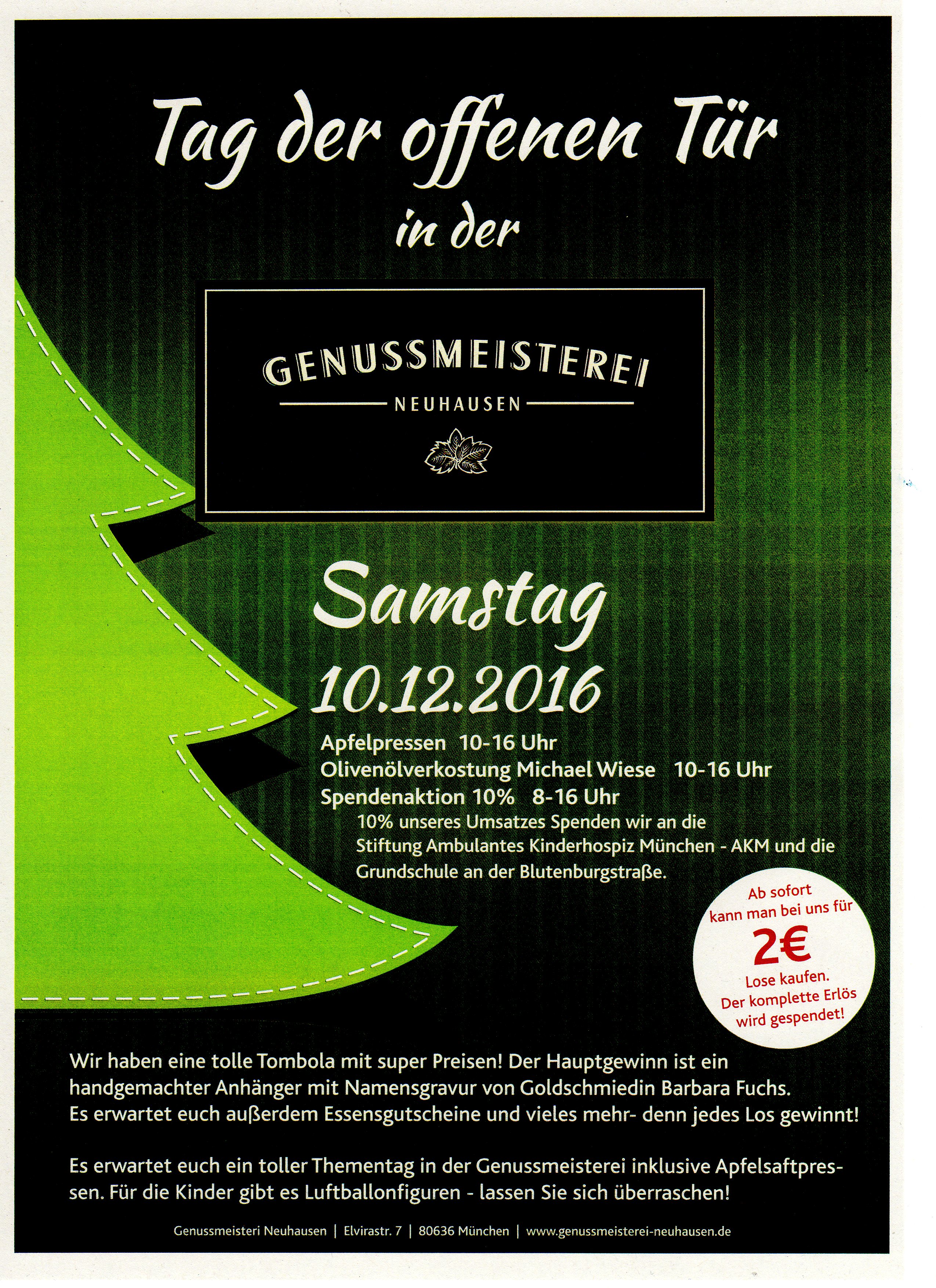 Am Samstag, den 10.12.2016, findet in der Genussmeisterei Neuhausen eine große Spendenaktion zugunsten unseres Fördervereins statt.