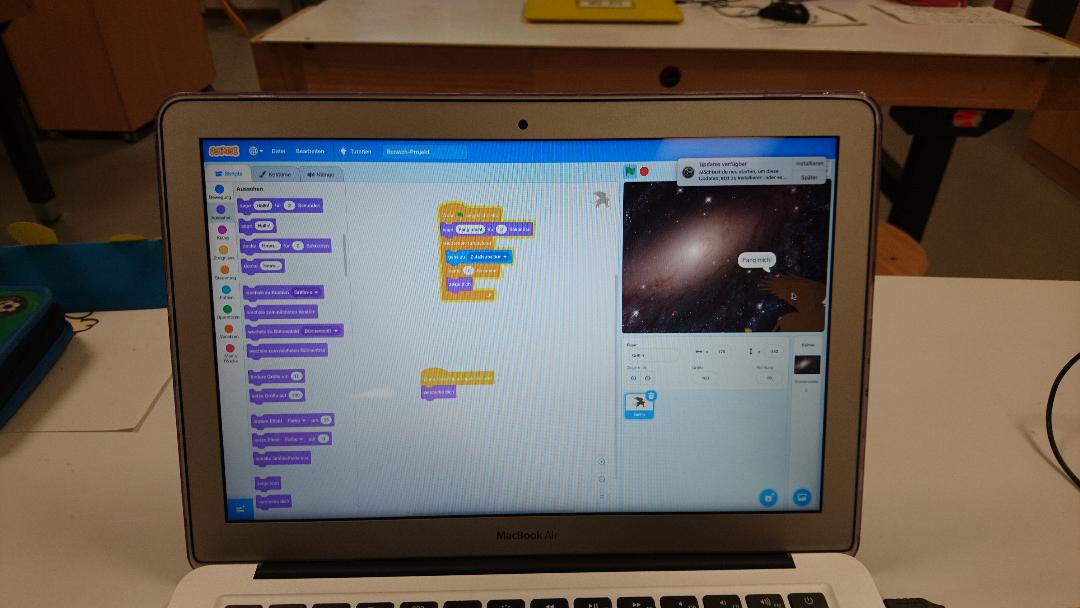 Anschließend durften wir immer zu zweit an einem Laptop unser ganz eigenes Computerspiel programmieren.