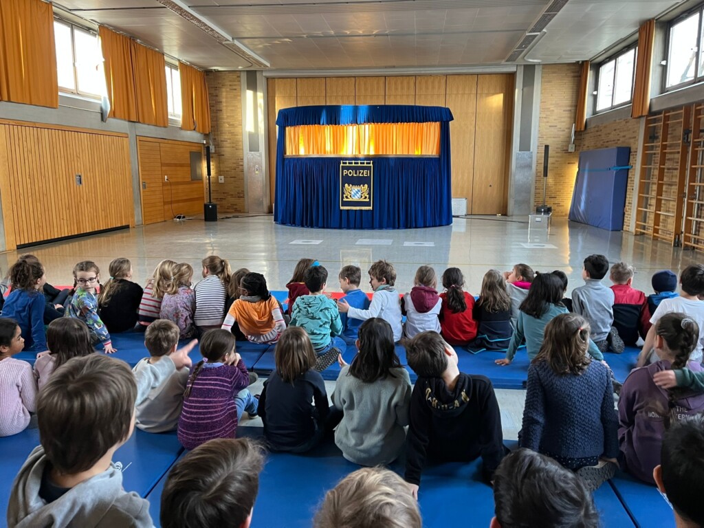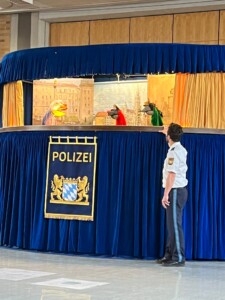 Besuch der Blutenburgschule bei der Verkehrspuppenbühne mit Polizeihund Wacki und Hauptkommissar Bürstenhuber „Die Polizei dein Freund und Helfer!“ Dieses Gefühl vermitteln die Münchner Polizisten den Grundschulkindern in vielen Situationen in und außerhalb der Schule. Eine große Verbundenheit bei vielen Kindern entsteht dabei durch die Verkehrspuppenbühne, die dieses Jahr endlich wieder live an der Grundschule an der Dieselstraße stattfinden konnte.