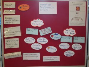 Anschließend sammelten die Kinder, was sie an unserer Schule verbessern wollen und stimmten ab, für welche drei Themen sie am Schnellsten eine Lösung finden wollen. Danach formulierten sie noch zusammen Wünsche. Das Ergebnis wurde an einer Stellwand präsentiert: